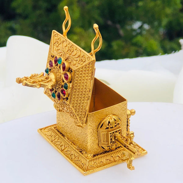 This exquisite antique-style Kumkum box is beautifully crafted in the shape of a royal palki (palanquin), symbolizing tradition and devotion. Adorned with intricate carvings, miniature figurines, and fine detailing, it is topped with a graceful Radha-Krishna idol. The box is embellished with colorful stones, enhancing its divine charm.