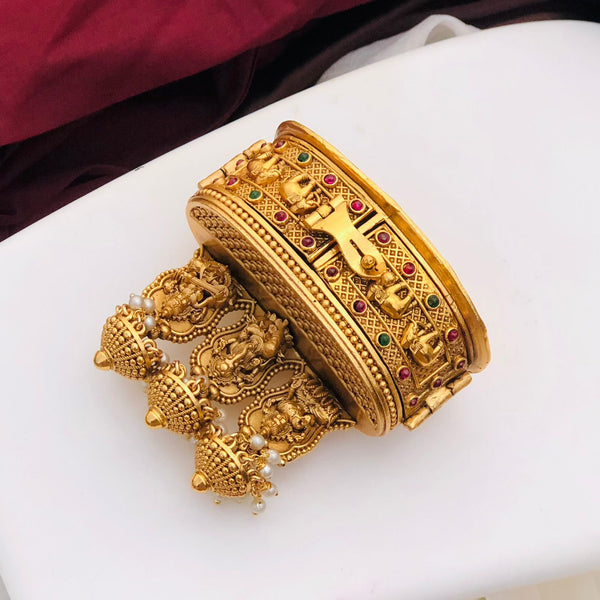 Enhance your pooja rituals with this exquisite antique gold-plated kumkum box. Designed in an elegant temple style, it features intricate carvings of deities adorned with delicate pearl hangings. The box includes multiple compartments, perfect for storing kumkum, haldi, and other sacred powders. Crafted with a traditional touch, this kumkum box is not only functional but also adds a divine charm to your pooja room. A perfect choice for gifting on weddings, housewarmings, and festive occasions.