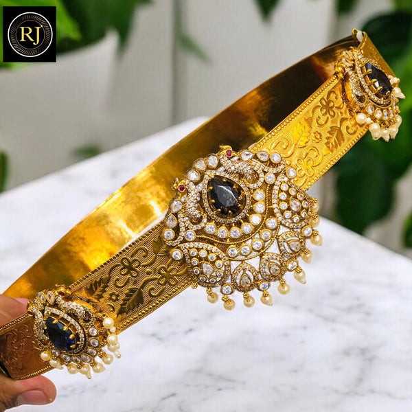 blessings, timeless beauty, and cultural flair with the captivating Peacocks Crafted Antique Ad Hip Belt from Radhe jewellery. Part of our coveted Antique Collection, this exquisite hip belt features intricate detailing showcasing the revered flanked by majestic ram darbar. Crafted with a touch of antique charm and adorned with sparkling zircon stones, and green embellishments, this belt adds a touch of opulence and cultural significance to your traditional attire.