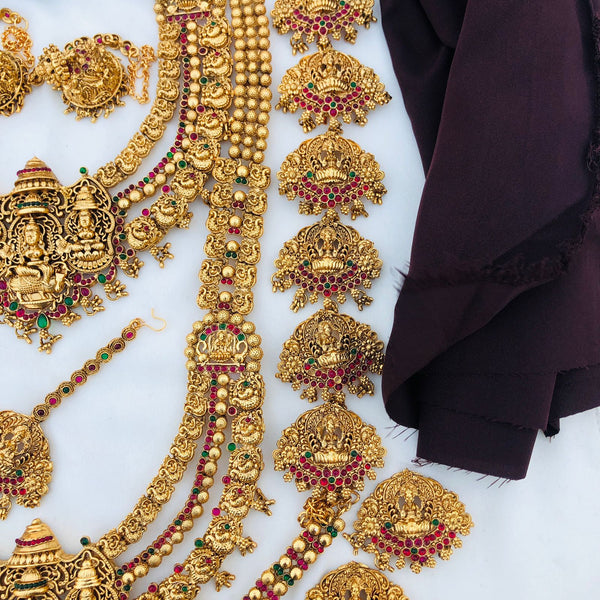 A splendid matte finish full bridal set apt for the beautiful bride who wants to look traditional and homely, to match her wedding lehenga and bridal wear consisting of 17 items