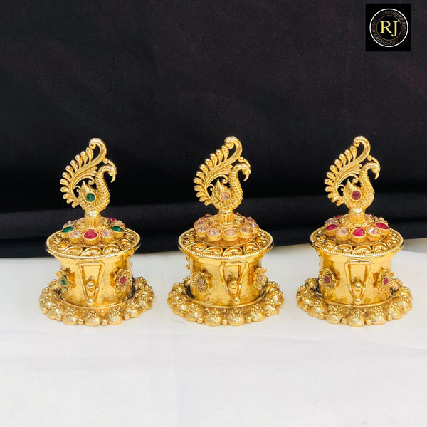 Enhance your pooja rituals with this beautifully handcrafted Kumkum Box featuring an elegant peacock design. Made with a gold-plated finish and adorned with multicolor stones, this traditional box is perfect for storing kumkum, haldi, or sindoor. Its intricate detailing and artistic craftsmanship make it not only a functional pooja essential but also a decorative keepsake. Ideal for gifting during weddings, festivals, and special occasions.