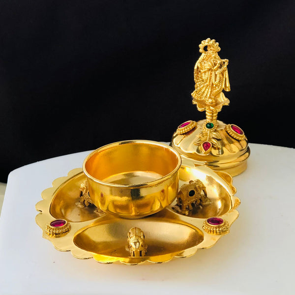 This elegant golden pooja kumkum plate is beautifully designed with intricate detailing. It features a central bowl and multiple compartments for holding kumkum, haldi, and other pooja essentials. The plate is adorned with decorative miniature elephants and embellished with red and green stonework. A finely crafted Lord Krishna idol enhances its divine charm, making it a perfect addition to your home temple, festive rituals, or as a spiritual gift. Crafted with a luxurious golden finish, it symbolizes prosperity, devotion, and auspiciousness.
