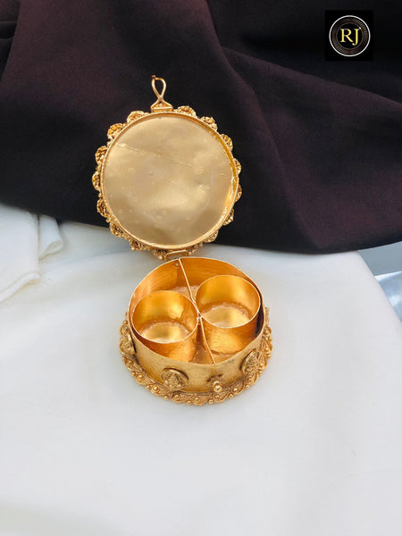 • Discover the splendor of traditional Indian artistry with this stunning gold-plated Kumkum Bharani.