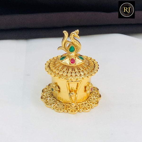 Enhance your pooja rituals with this beautifully handcrafted Kumkum Box featuring an elegant Peacock design. Made with a gold-plated finish and adorned with multicolor stones, this traditional box is perfect for storing kumkum, haldi, or sindoor. Its intricate detailing and artistic craftsmanship make it not only a functional pooja essential but also a decorative keepsake. Ideal for gifting during weddings, festivals, and special occasions.