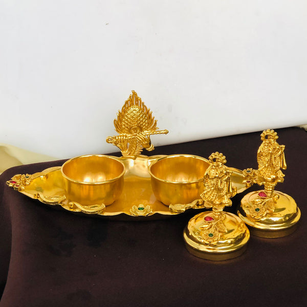 This elegant golden twin kumkum box is beautifully crafted with intricate detailing, featuring two round containers placed on a decorative base. Each box comes with a lid adorned with a Lord Krishna idol, adding a divine charm. The centerpiece showcases a detailed peacock design, symbolizing prosperity and devotion. The tray is further embellished with floral engravings, ornamental accents, and colorful stones, making it perfect for storing kumkum, haldi, or other pooja essentials. An ideal choice for festive rituals, home temples, and gifting, this kumkum box reflects tradition, grace, and spirituality.