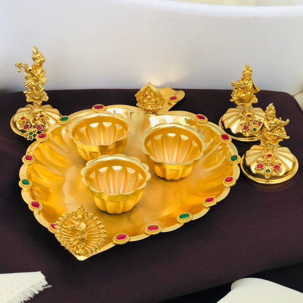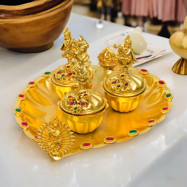 This stunning golden kumkum box set features three beautifully designed containers placed on a decorative heart-shaped plate. Each box is topped with intricate Krishna idols and embellished with colorful red and green stones for a divine and traditional look. The plate is further decorated with ornamental detailing and miniature deity engravings, making it perfect for storing kumkum, haldi, or pooja essentials. Ideal for festive occasions, temple use, and traditional gifting, this kumkum box set adds elegance and spirituality to any ritual.