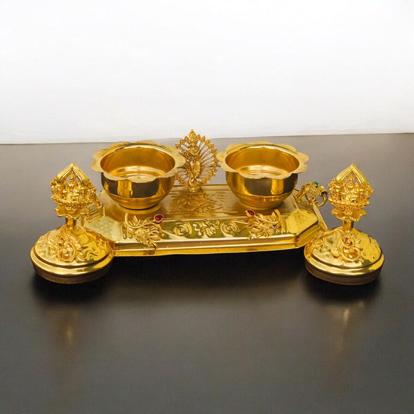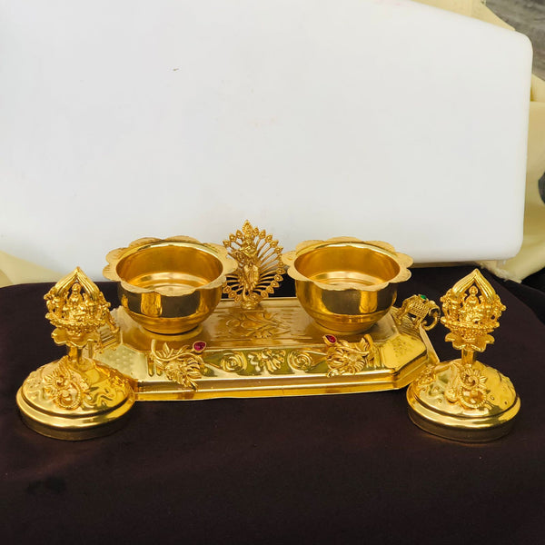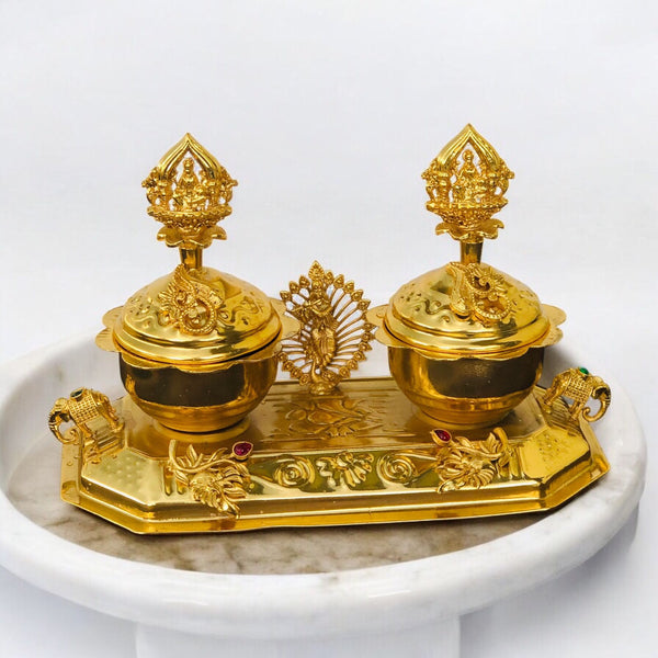 This premium golden double kumkum box is crafted with intricate artistry, featuring two beautifully designed bowls with ornamental lids. Each lid is adorned with divine motifs, while the base is embellished with floral engravings, colorful stone accents, and miniature elephant figurines for an auspicious touch. At the center, a finely crafted deity design enhances its spiritual elegance. Ideal for storing kumkum, haldi, or sacred offerings, this decorative piece is perfect for pooja rituals, festive occasions, and gifting. A symbol of tradition and devotion, it brings grace and prosperity to your home temple.