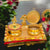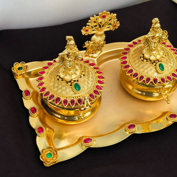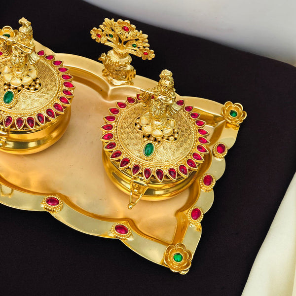 This luxurious golden kumkum box set features two intricately crafted containers adorned with Lord Krishna idols on the lids and a central floral motif. The lids and tray are beautifully decorated with red and green stone embellishments, adding a touch of grandeur. Perfect for storing kumkum, haldi, or pooja essentials, this set is ideal for festive rituals, home temple décor, and traditional gifting. A symbol of devotion, elegance, and prosperity
