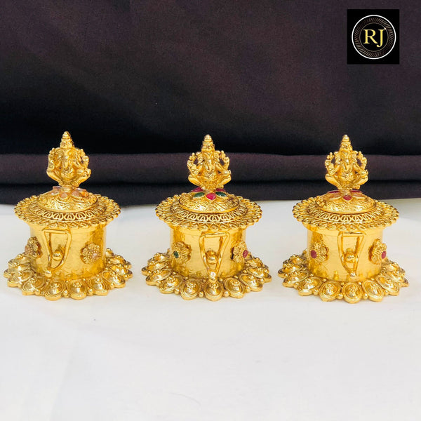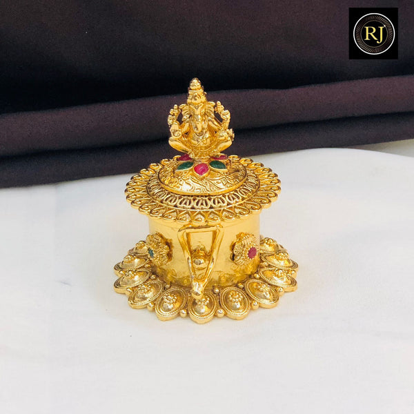 Bring divine elegance to your pooja rituals with this exquisite Kumkum Box, featuring Goddess Lakshmi seated gracefully on the lid. Crafted with a gold-plated finish and adorned with red and green stones, this traditional box is ideal for storing kumkum, haldi, or sindoor. Its intricate temple-style design makes it a perfect blend of devotion and artistry, adding charm to your pooja decor. A meaningful gift for weddings, festivals, and special occasions.