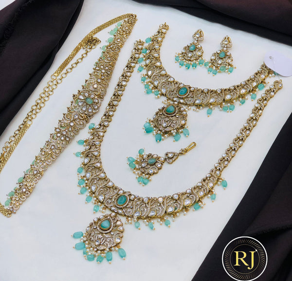 Make every bridal look grand and traditional with this royal temple jewellery set, designed for weddings, festive occasions, and classical bridal styling. This premium set features two layered statement necklaces with intricate temple motifs, matching chandbali earrings, a detailed waist belt (vaddanam/kamarbandh), and coordinated accessories — creating a complete regal bridal appearance.