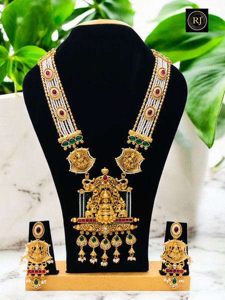 Paired with matching Lakshmi motif jhumka earrings, this set is perfect for brides, festive wear, classical dance, and traditional occasions.