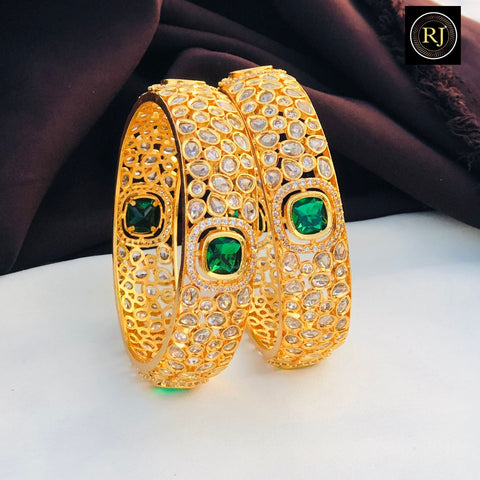 Metal – Brass alloy with gold platingStone – Cubic zirconia, KundanLock – ScrewSize-2.4/2.6/2.8Set of: 2 Stunning gold plated kundan kada bangle is a timeless piece that will provide you with years of beautiful wear....