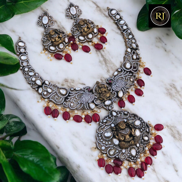 Crafted with intricate temple motifs, the centerpiece features beautifully detailed Goddess Lakshmi designs, surrounded by sparkling kundan-style stones and rich ruby-colored drops. The antique gold tone gives the set a regal and timeless appeal, making it perfect for weddings, festive occasions, and special celebrations.